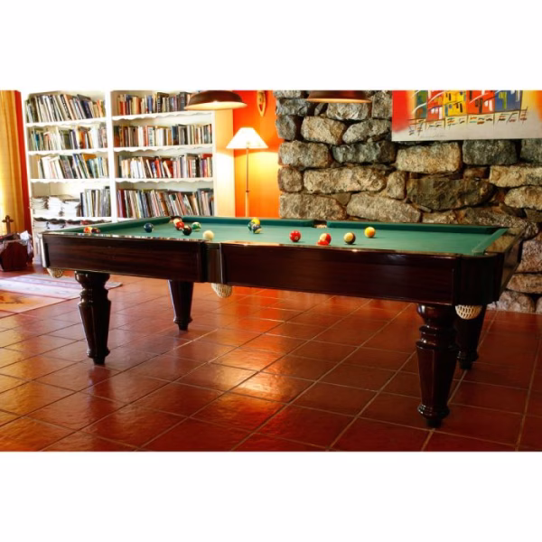 El campo de juego de la Popular Classico de 8 pies se apoya sobre un bastidor de acero y está compuesto por una pizarra de tres piezas de 30 mm de grosor. El marco superior está fabricado en madera maciza y las patas están hechas de MDF chapado. Su alta calidad de construcción garantiza una gran estabilidad y una excelente experiencia de juego.