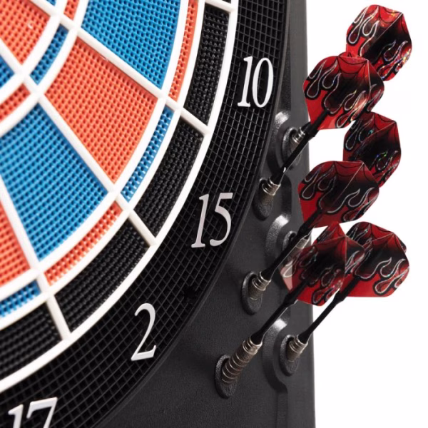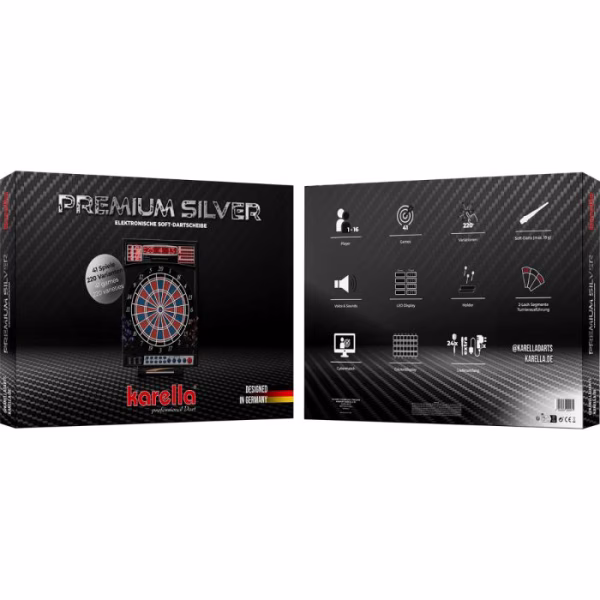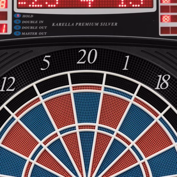 La Karella Premium Silver es una diana electrónica de punta blanda (soft-tip) de última generación, diseñada para partidas de alto nivel. Su elegante diseño y sus numerosas configuraciones de juego la convierten en una opción ideal para jugadores competitivos. El sistema de sonido con altavoz controlado por ordenador anuncia las puntuaciones con espectaculares efectos sonoros, potenciando la experiencia de juego.