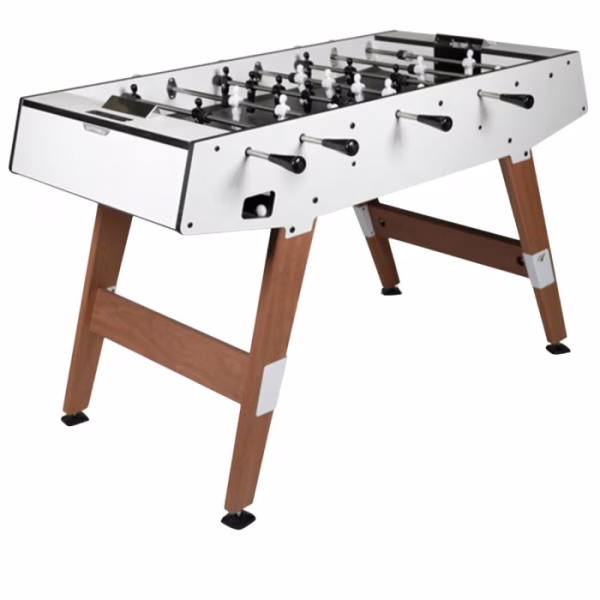 Aunque lo primero que llama la atención es su estética negra, sus auténticas virtudes se encuentran en las decisiones de ingeniería. El campo de juego, de color negro, está formado por una superficie de Gerflex sobre un laminado de resina: el Gerflex garantiza un control excelente del balón y un deslizamiento fluido. Las bandas laterales inclinadas mantienen la pelota en movimiento constante. El armazón está construido en laminado de resina negra resistente a impactos y condiciones climáticas, mientras que las patas son de madera Moabi, conocida por su resistencia natural a la humedad y su gran durabilidad. Dos robustas traviesas de madera refuerzan la estabilidad global, y los pies antideslizantes regulables en altura (hasta 5 cm) aseguran un apoyo firme sobre cualquier superficie.